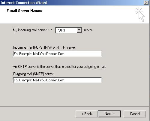 در قسمت Incoming mail or POP3 server تايپ كنيد: Mail.YourDomain.com در قسمت Outgoing mail or STMP server تايپ كنيد:Mail.YourDomain.com گزينة Next را انتخاب نماييد.